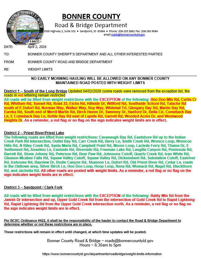 For additional information, contact Bonner County Road & Bridge at 208-255-5681, extension #1 between the hours of 6:30 am and 5 pm.