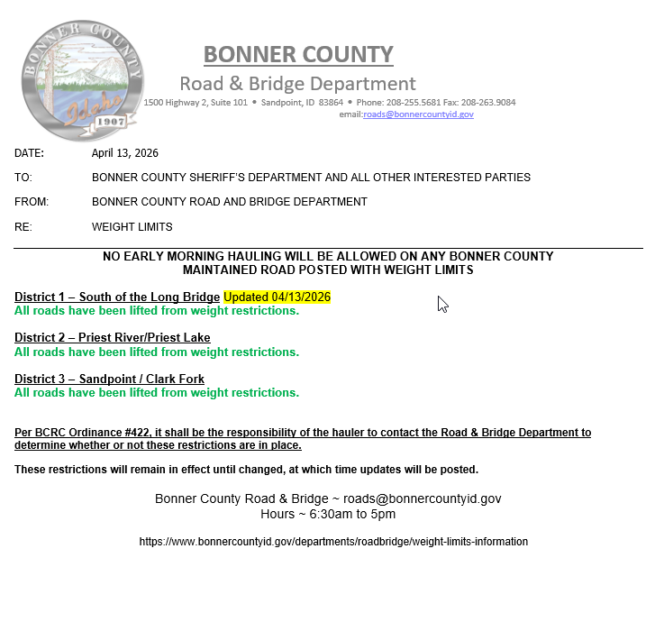 For additional information, contact Bonner County Road & Bridge at 208-255-5681, extension #1 between the hours of 6:30 am and 5 pm.  Â